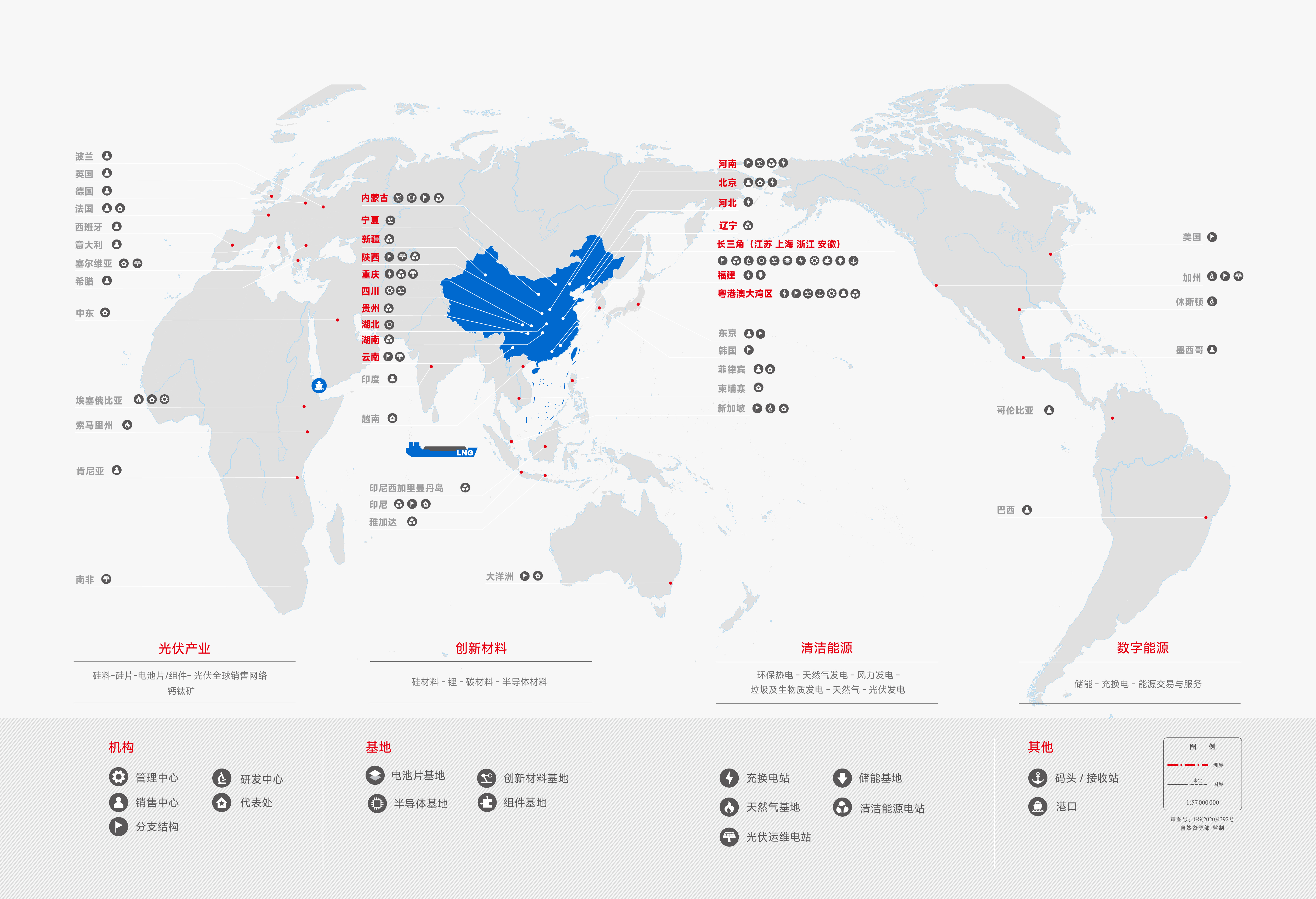 协鑫积极实施“绿色能源出海”计划,研发中心、生产基地和分支机构遍布美国、日本、新加坡、印尼、埃塞、泰国、印度、澳大利亚、德国、韩国等二十多个重点国别市场以及北美、南美、中东、欧洲、中亚多国,产品及解决方案覆盖全球70多个国家和地区,在全球多地晋升为产品全生命周期碳足迹领先的主力供应商。
