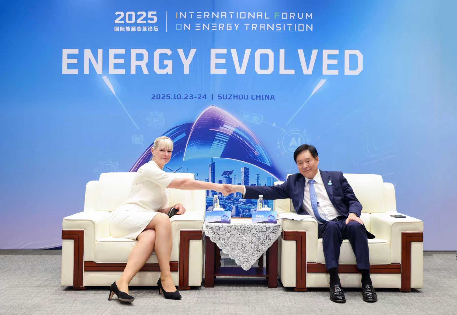 10月24日,2025国际能源变革论坛在江苏苏州举办期间,全球绿色能源理事会主席、亚洲光伏产业协会主席、协鑫集团董事长朱共山,与世界能源理事会总干事安吉拉・威尔金森博士举行会晤。双方立足全球能源治理与可持续发展大局,围绕能源组织合作、国