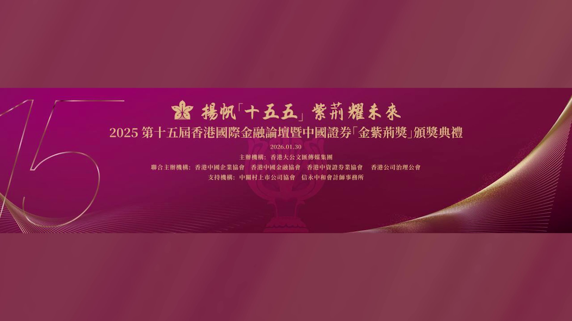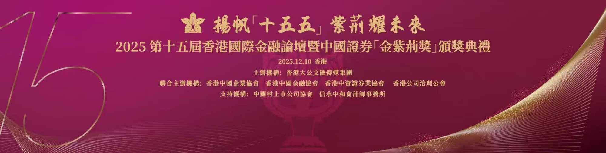 本届金紫荆奖以“扬帆十五五 紫荆耀未来”为主题,汇聚逾三百位来自内地与香港的财经官员、金融机构负责人及上市公司高管。全国政协委员、香港大公文汇传媒集团董事长李大宏,香港特区政府财政司副司长黄伟纶等嘉宾为论坛开幕式致辞。颁奖典礼共颁出“2025年度经济人物”、“2025年度卓越企业家”、“卓越上市公司CEO”、“卓越上市公司CFO”、“卓越上市公司董事会秘书”、“卓越上市公司”、“卓越高质量发展上市公司”、“卓越投资者关系管理上市公司”、“最具投资价值上市公司”、“卓越长期价值回报上市公司”共计11大类奖项。